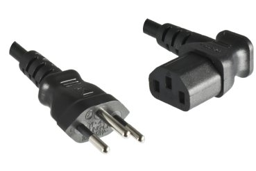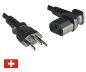- Steckertypen: Das Kabel ist mit einem 3-poligen, teilisolierten Schweizer Stecker Typ J (Typ 12) ausgestattet und bietet am anderen Ende einen 90° seitwärts abgewinkelten C13 Kaltgerätestecker.